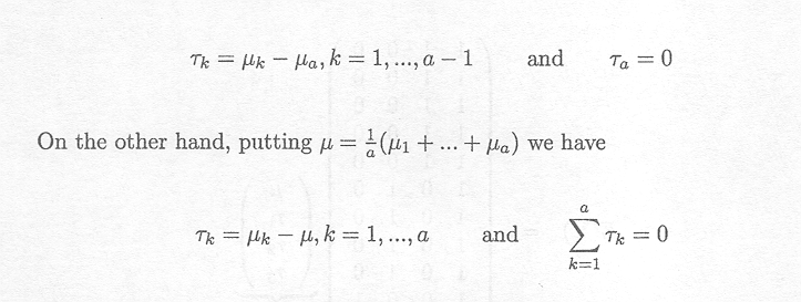 Note that since the model is overparameterised (in the sense that the model has a+1 parameters compared with a parameters in the cell means model) each choice of the reference value leads to some constraint (e.g. ta = 0 if µ = µa).