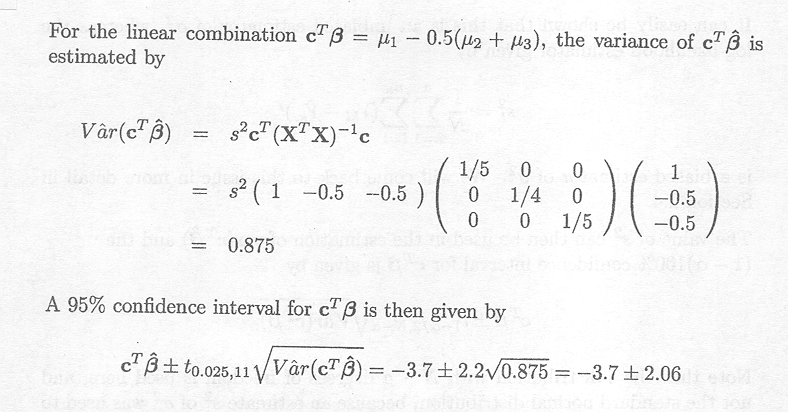 In order to derive confidence intervals for these linear combinations, based on the t-distribution, the degrees of freedom associated with the variance term need to be calculated.