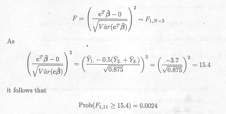 It can be shown that the value of the F-statistic is 31.2 and that the denominator degrees of freedom equal 7.14. The rank of C and thus the numerator degrees of freedom equal 3. Therefore, the P-value is Prob(F3,7 = 31.2) = 0.0002. The null hypothesis is clearly rejected. The corresponding SAS program is given in Appendix B.2.9.