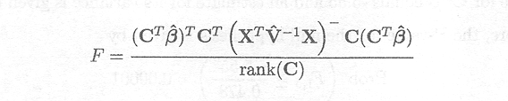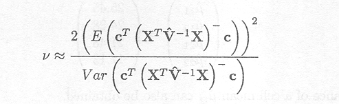 As can be seen from this expression, F is no longer a ratio of two mean squares as in the fixed effects model. The role of the denominator is taken over by (XTV. 1X). The denominator degrees of freedom, v2, thus correspond to the degrees of freedom associated with (XTV. 1X) and can be approximated by the Satterthwaite procedure in a similar way as shown for the t-test. Further details on these approximate F-tests for general linear hypotheses are in Fai and Cornelius (1996).