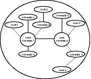 In order to maximise the benefits gained from linkages between national institutions in the region it will be important to broaden the network to encompass other institutions and networks within and outside the region as illustrated in Figure 2. For instance, existing regional agricultural research networks in East and southern Africa recognise the subjects of experimental design, statistical analysis, interpretation and presentation of results to be among the top priorities for training of scientists. An increased biometric input into the research of these networks would be an important step and raise the profile of biometrics in the region. Coe (this proceedings) describes possibilities for enhancing the contributions that international agricultural research centres (IARCs) can make in increasing the capacity and effectiveness of biometricians in national agricultural research systems (NARS). Potential benefits achieved from close collaboration with advanced institutions abroad are also emphasised (e.g. Dicks and Njuho; Janssen, this proceedings). Various institutions can be linked to extend the network as conceptualised in Figure 2.