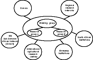 It is likely that a steering group will be necessary to allow such a network to function efficiently (Figure 2). Such a group, modelled on other existing research networks, could, for instance, comprise a representative from each of Kenya, Malawi, Tanzania, Uganda and Zimbabwe who would elect a chairman from amongst themselves. Two other members could also join the steering group, namely a representative from the IARCs, to provide, in the initial stages, the secretariat and a representative from other advanced institutions. The terms of reference of the steering group could cover such activities as: